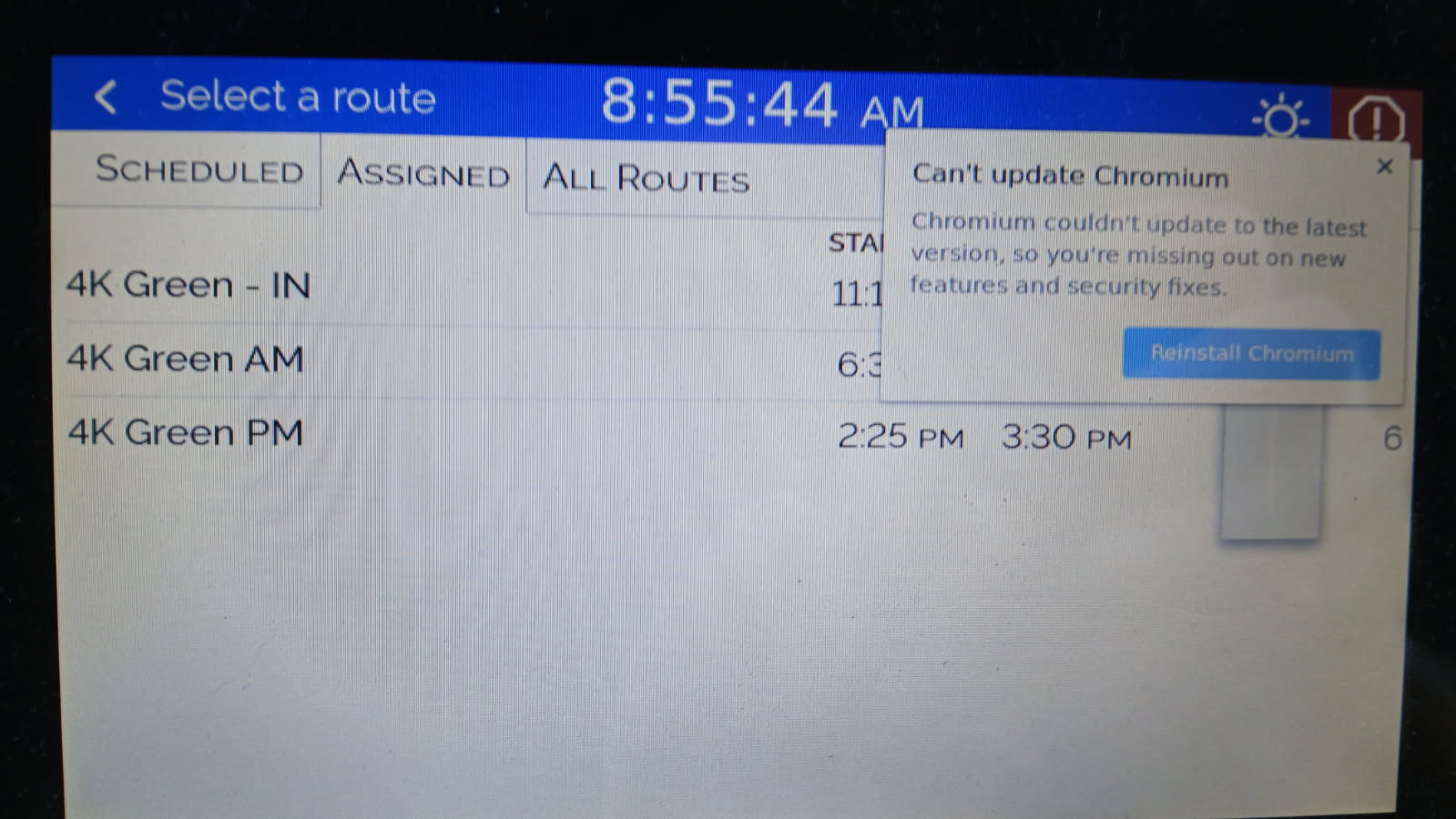 If you or a driver see this message, press the button labeled "Reinstall Chromium" as seen in the photo above.