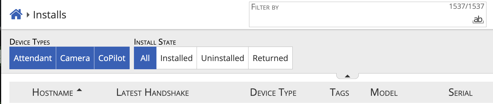 Installs page. Here you will see all the devices (attendants, copilots, and cameras) that are now or have been allocated to your school system.