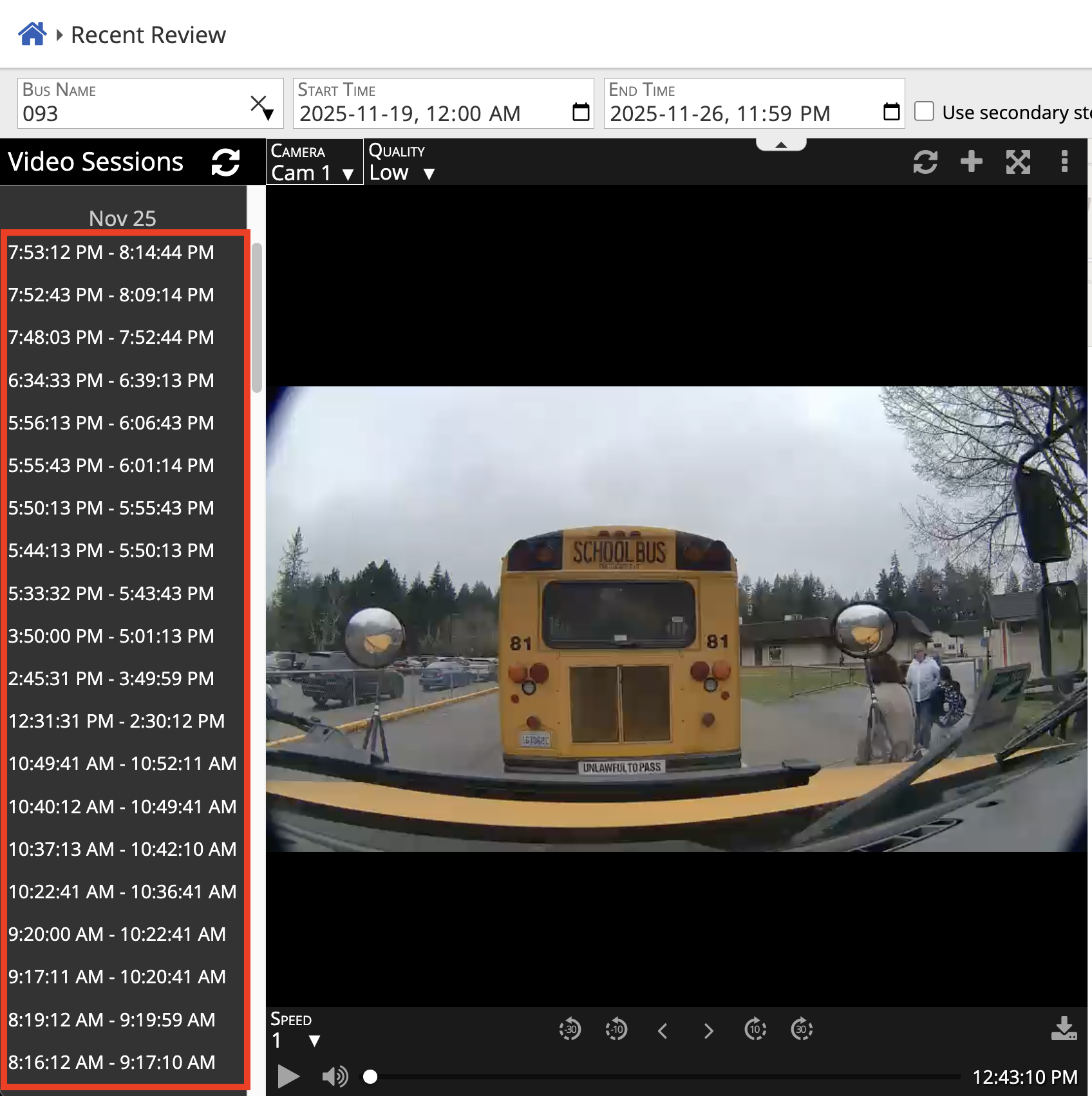Each entry in the recent review playlist corresponds to a video session. A number of things can cause a session to end and a new session to begin: restarting the attendant, switching connectivity between Wi-Fi and cellular, entering or leaving a do not record location, or if the bus's engine is shut off or started up. If the attendant believes that one of these things is happening rapidly and repeatedly, then there will be many brief video sessions, which will be reflected in the recent review playlist as seen above.